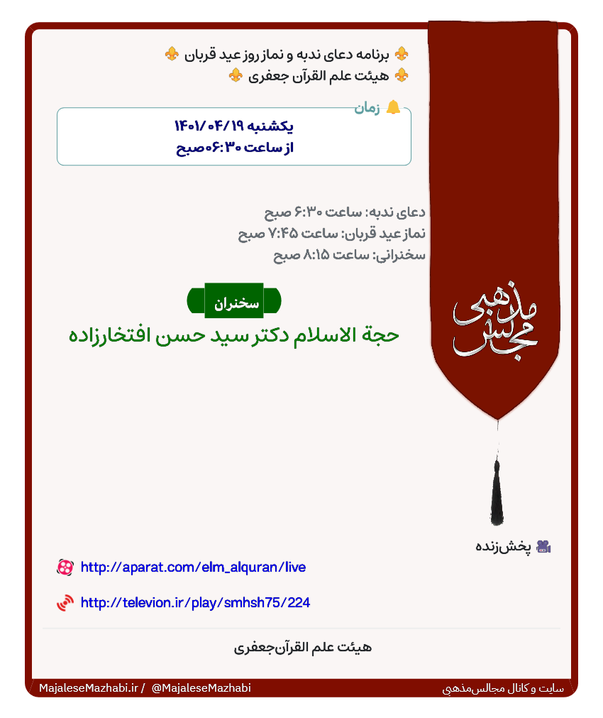 ⚜️ برنامه دعای ندبه و نماز روز عید قربان ⚜️ ⚜️ هیئت علم القرآن جعفری ⚜️ |