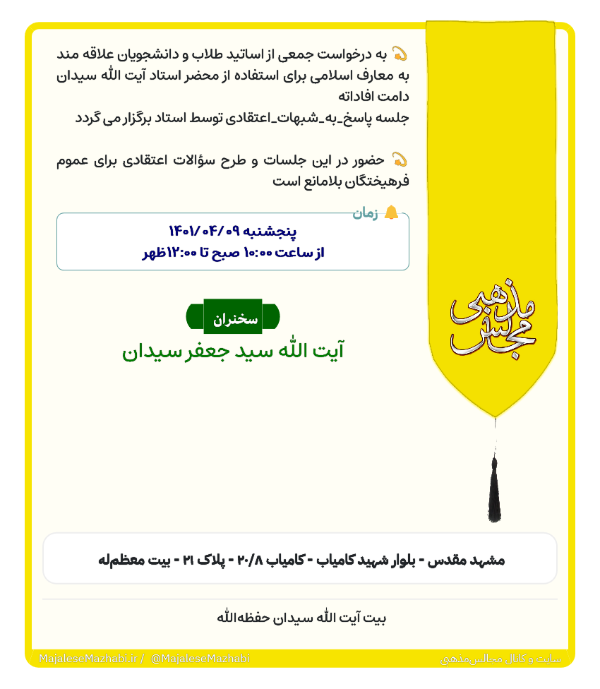💫 به درخواست جمعی از اساتید، طلاب و دانشجویان علاقه مند به معارف اسلامی برای استفاده از محضر استاد آیت الله سیدان دامت افاداته جلسه #پاسخ_به_شبهات_اعتقادی توسط استاد برگزار می گردد. 💫 حضور در این جلسات و طرح سؤالات اعتقادی برای عموم فرهیختگان بلامانع است.