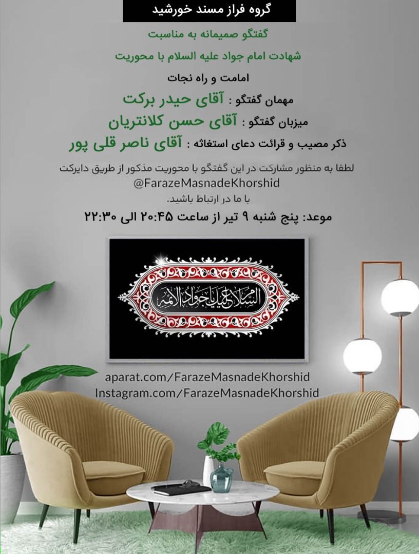 گروه فراز مسند خورشید گفتگوی صمیمانه به مناسبت شهادت امام جواد علیه السلام با محوریت: امامت و راه نجات (توجه توجه) لینک ثبت نام جهت حضور در برنامه